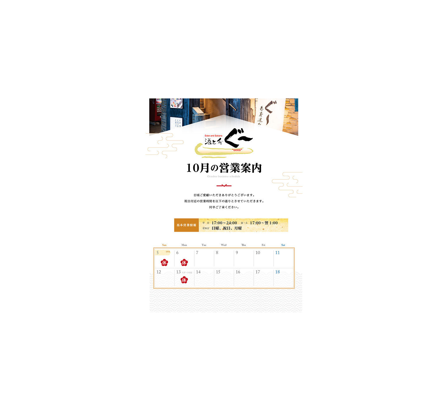 10月の営業カレンダーをご用意いたしました。